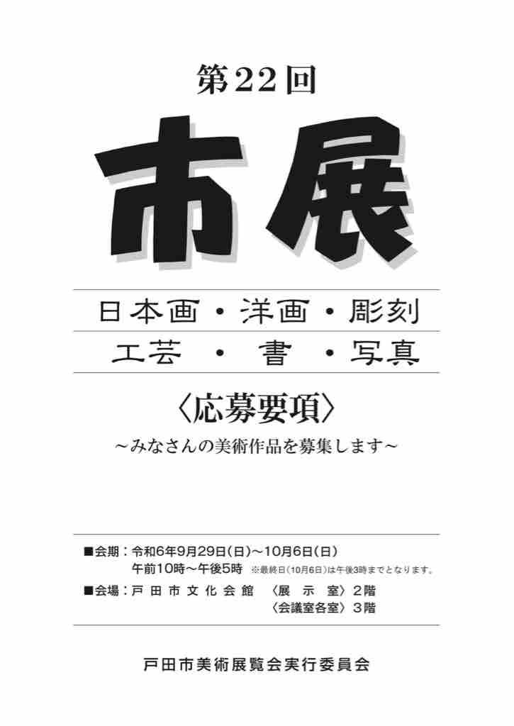 ¢£¸ÍÅĻԡÖÂè22²ó»ÔŸ¡×¤Ï9·î29Æü¤«¤é10·î6Æü¤Þ¤Ç¸ÍÅÄ»Ôʸ²½²ñ´Û¤Ç³«ºÅ¤µ¤ì¤Þ¤¹¡£½ÐŸ¿½¹þ¤Ï´û¤Ë»Ï¤Þ¤Ã¤Æ¤¤¤Æ8·î30Æü¤¬¿½¹þÄùÀÚÆü¤Ç¤¹¡£³§ÍͤÎÈþ½ÑºîÉʤò½ÐŸ¤¯¤À¤µ¤¤¡ª