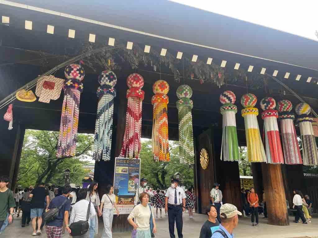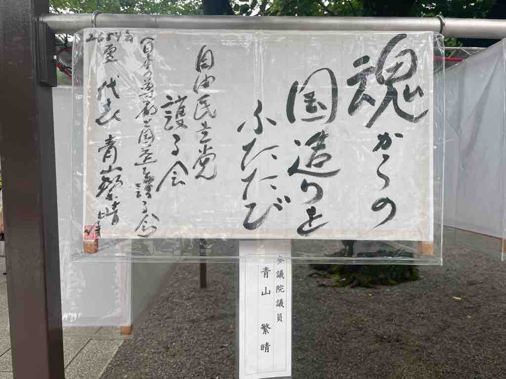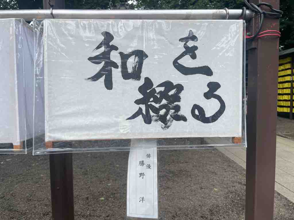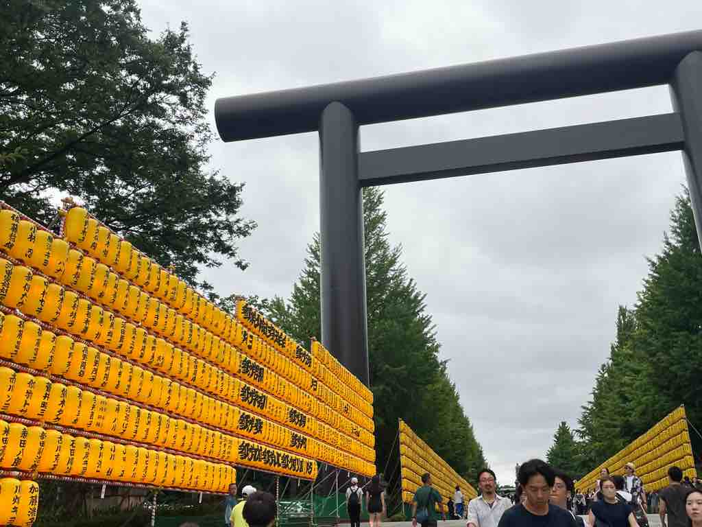 まつりで賑わう境内を背景に、祀られている英霊に向かい、一命を斗して皆の笑顔が溢れる今の日本に繋いでくださったことに感謝申し上げるともに、自分もまたこの国により良きものを積み上げて次世代に繋いでいくことをお誓い申し上げました。
