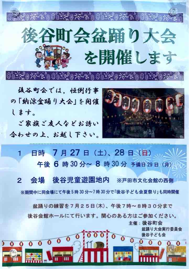 また、明日7月27日(土曜日)28日(日曜日)に行われるのが「後谷(うしろや)町会盆踊り」。会場は後谷児童遊園地になります。