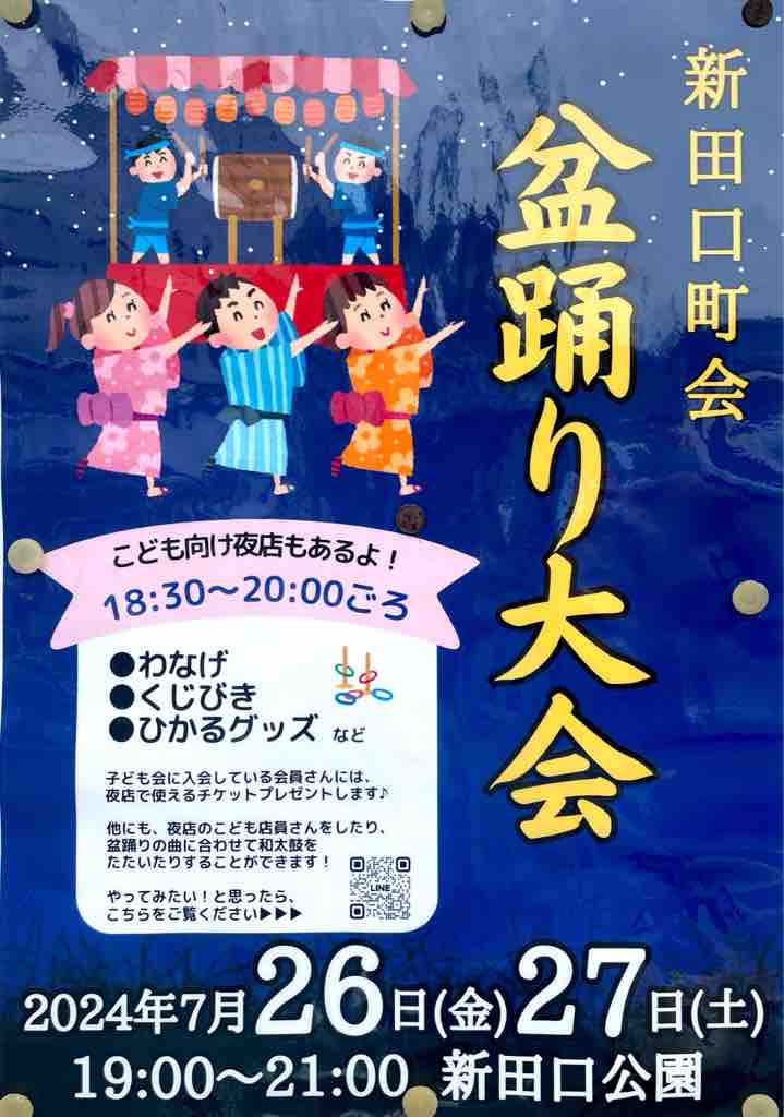 本日7月26日(金曜日)と明日27日(土曜日)に行われるのが「新田口(しんでんぐち)町会盆踊り」。会場は新田口公園になります。