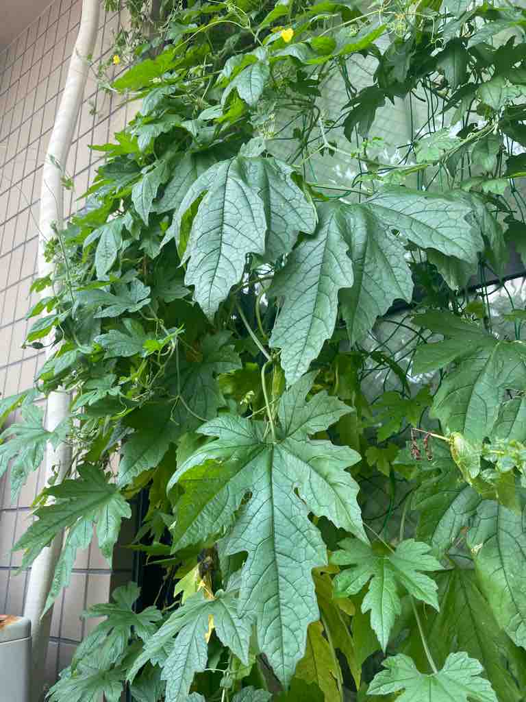 5月14日にいただいたゴーヤ苗は2ヶ月で緑のカーテンとなり、ゴーヤの実もつけました。さらにどんどん実がついてきましたが、そのいくつかはこのところの猛暑で弾けてしまい、種が飛び立ってしまいました。