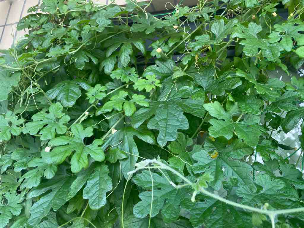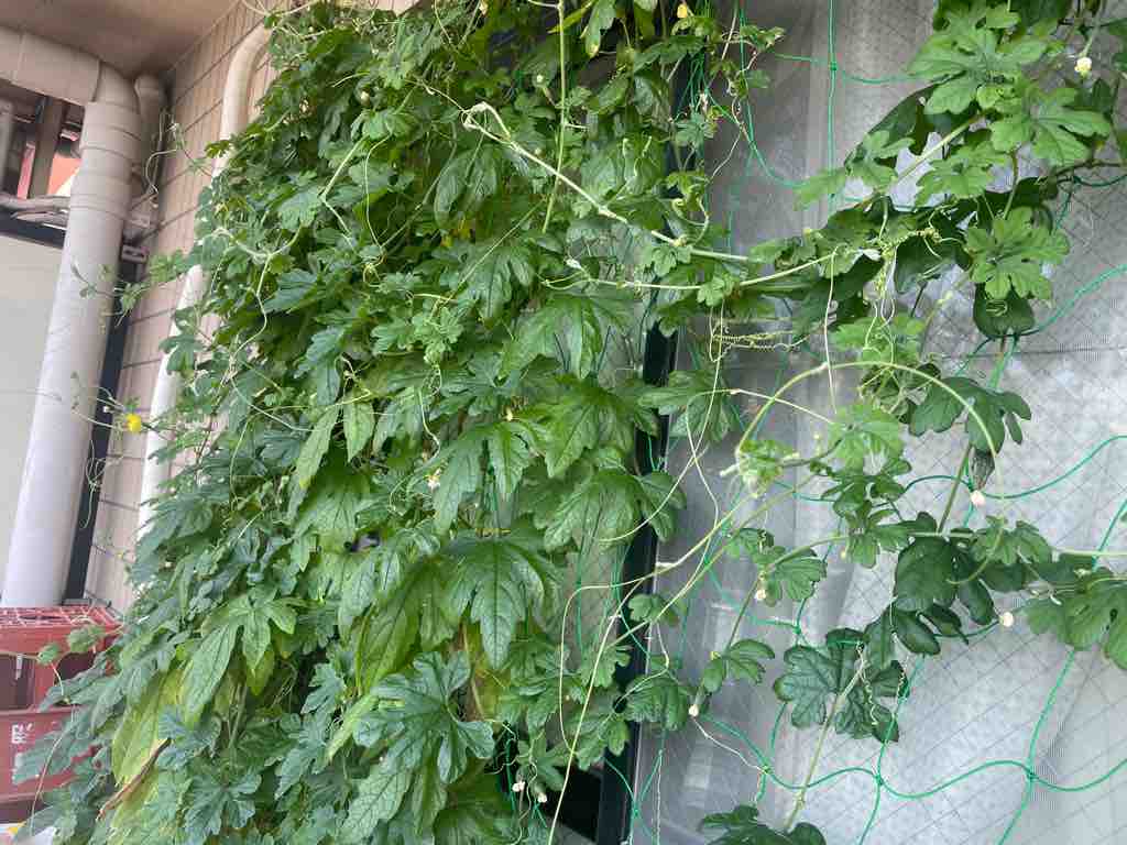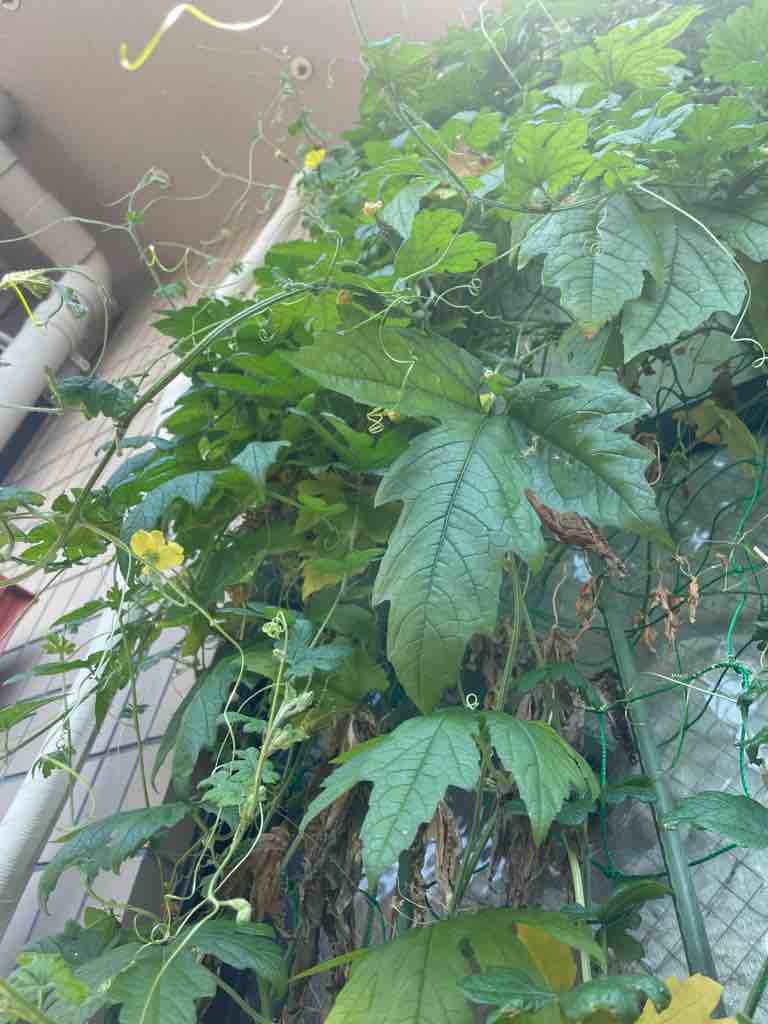 5月14日にいただいたゴーヤ苗は2ヶ月で緑のカーテンとなりました。最初はベランダの扉一つ分だけの緑のカーテンだったのですが、ゴーヤの成長が止まらず、横にもう扉一つ分ネットを張ったところ、そちらの方にもどんどん伸びてきました。