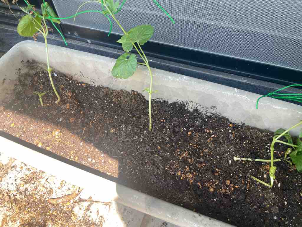 さらになった実から採れた種を播いたところ、太い芽が土が出て、新たに張ったネットにつるんできました。