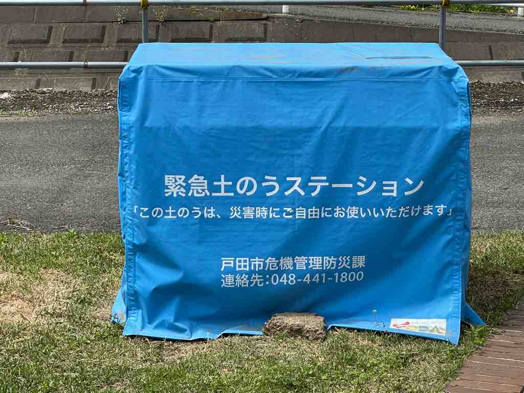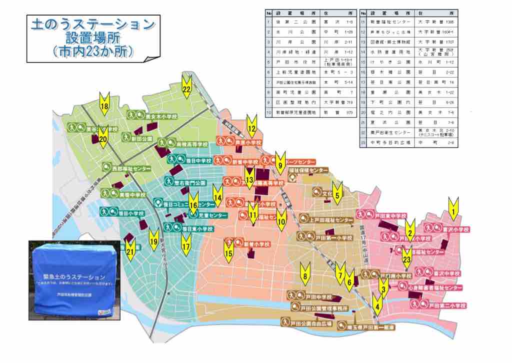 現在、戸田市では市内23ヶ所に、市民の方が必要に応じていつでも持ち出せる「土のうステーション」を設けています。