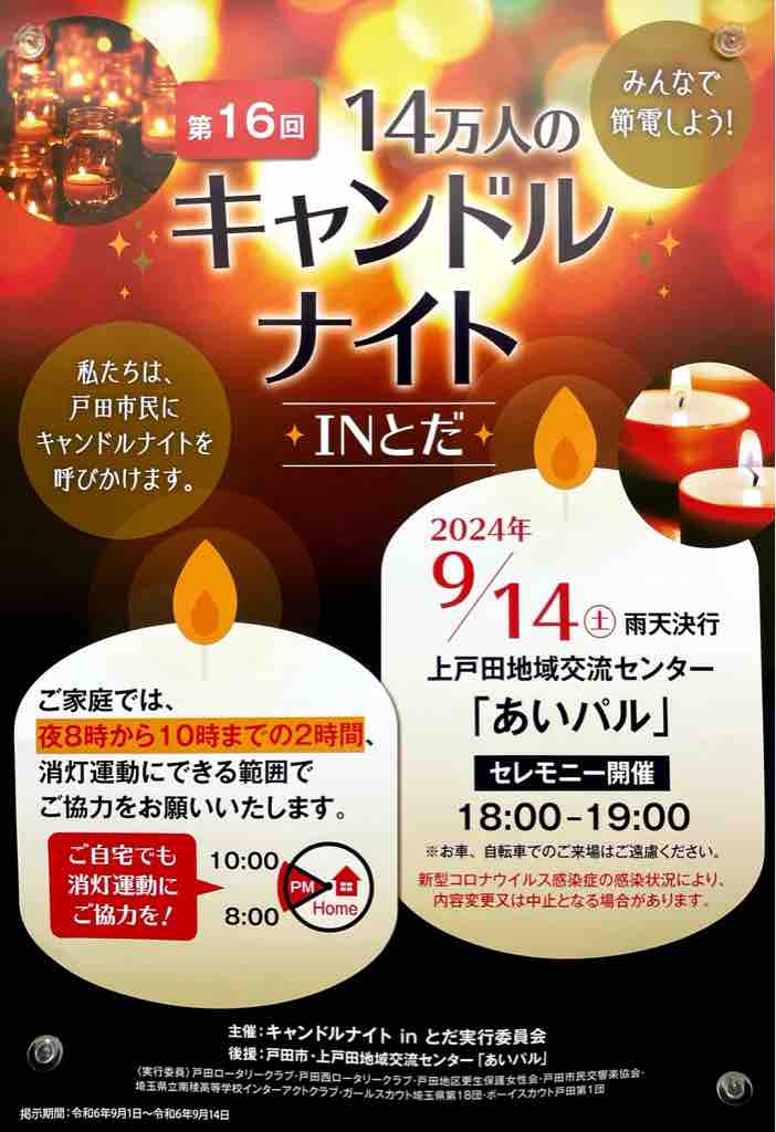◼︎【9月14日開催】「第16回14万人のキャンドルナイト IN とだ」があいパルを会場に18時より開催されます。LEDキャンドルの持ち帰りプレゼントあり。エネルギーの大切さを感じましょう。
