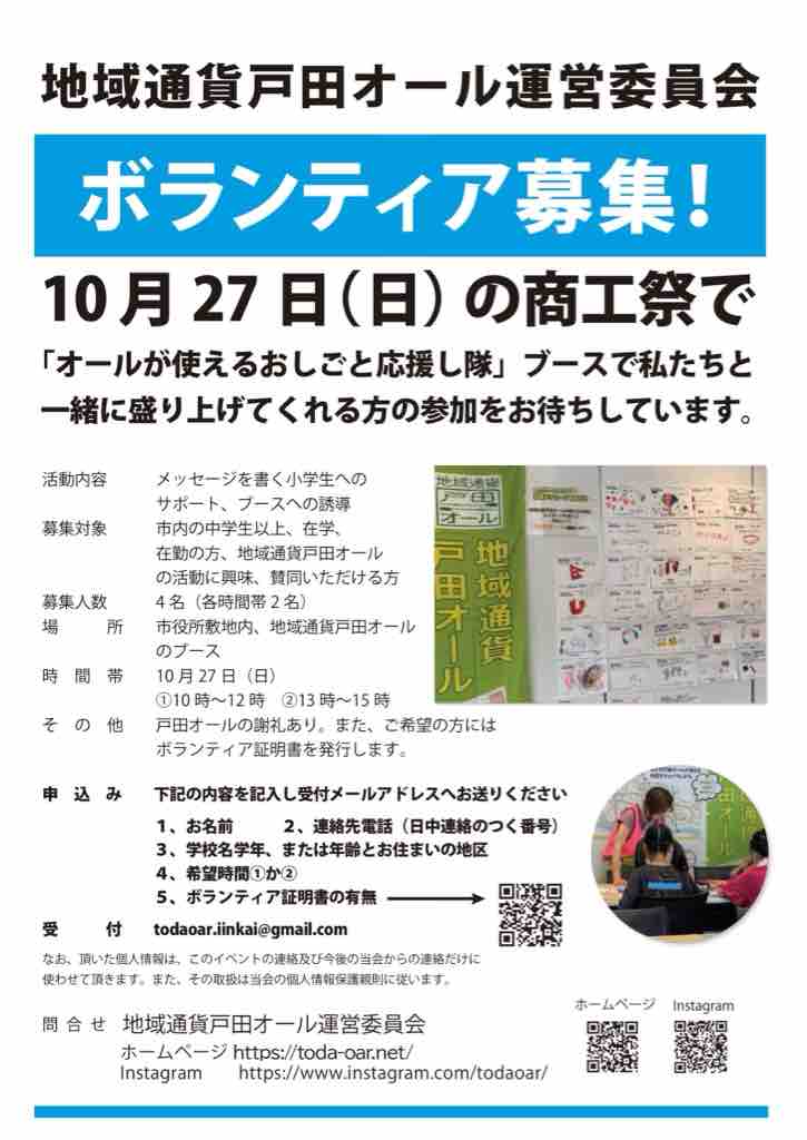 なお、商工祭開催日の2日目・10月27日(日)に、私も参加する地域通貨戸田オール運営委員会が「オールが使えるお仕事応援し隊」企画を行います。