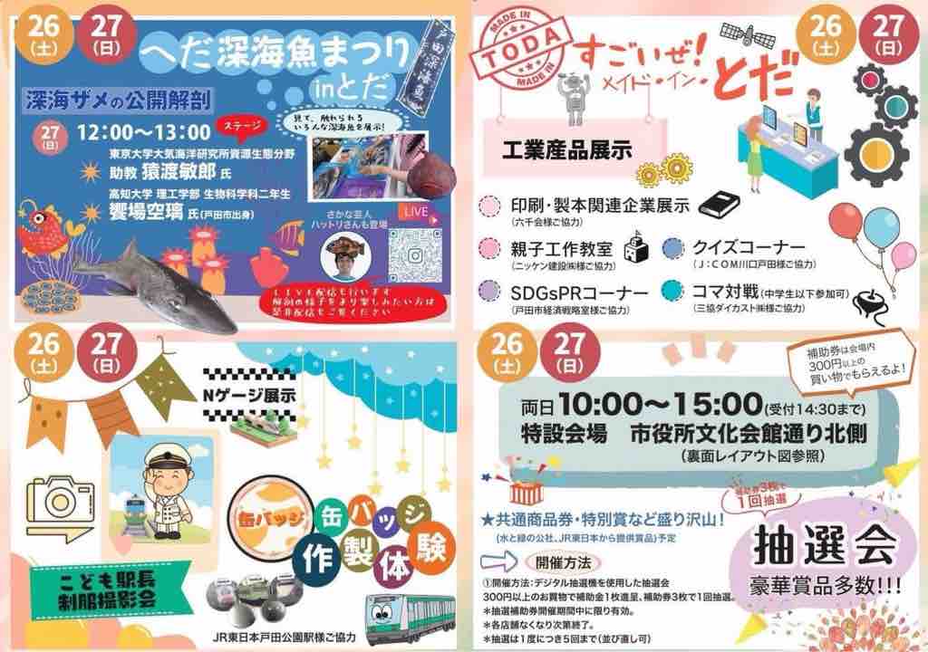 ◼︎戸田市商工会の第42回商工祭が戸田市役所と市役所西側の市役所通りを会場に本日と明日(26日・27日)開催。10時から16時。大人気「へた深海魚まつり」もありますよ!