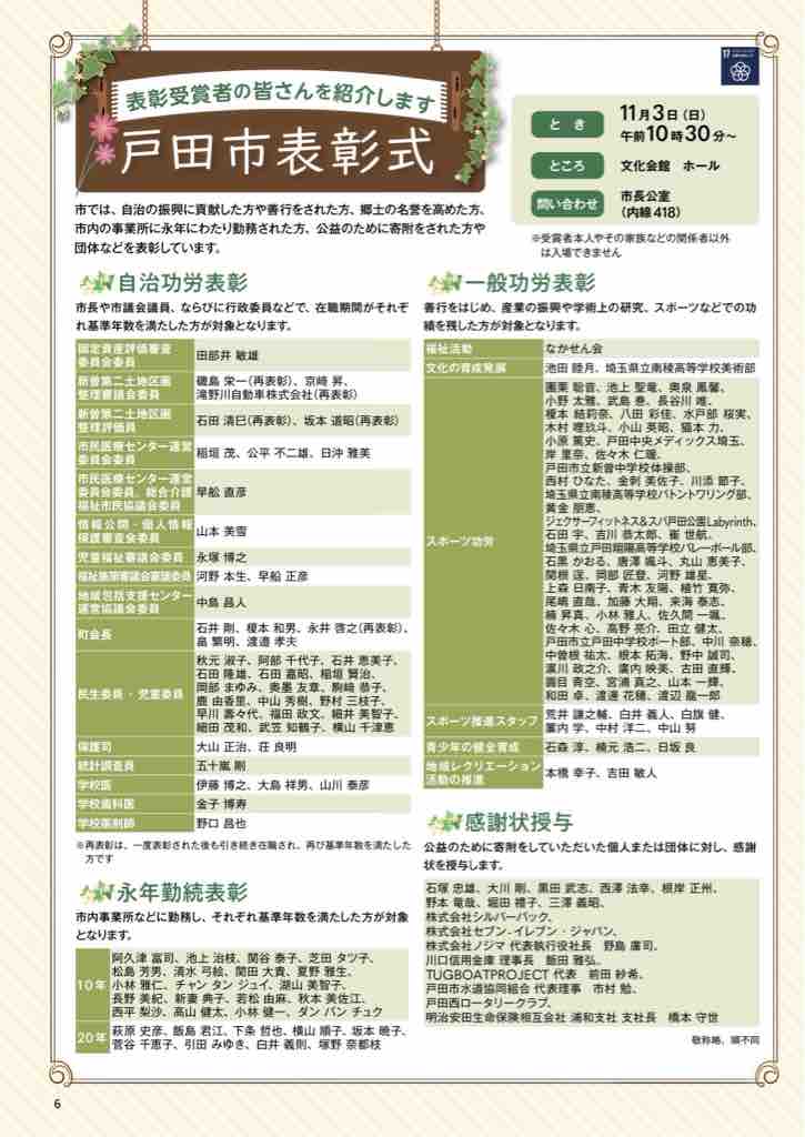 2024年11月03日 戸田市表彰式が戸田市文化会館大ホールで開催されました。自治功労46名、一般の功労73名、永年勤続28名、感謝状授与16名の方々が表彰されました。おめでとうございます。 ■戸田市表彰式が戸田市文化会館大ホールで開催されました。11月3日(日祝)10時半開式。自治功労46名、一般の功労73名、永年勤続28名、感謝状授与16名の方々が表彰されました。トダイルミ実行委員会代表の阿部あゆみさんの会社、株式会社シルバーバックさんも表彰されました。おめでとうございます! 「戸田市」カテゴリの最新記事 < 前の記事次の記事 > コメント コメントフォーム 名前 コメント 評価する リセット リセット 顔 星 投稿する 情報を記憶
