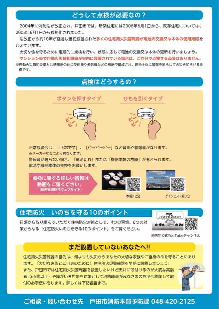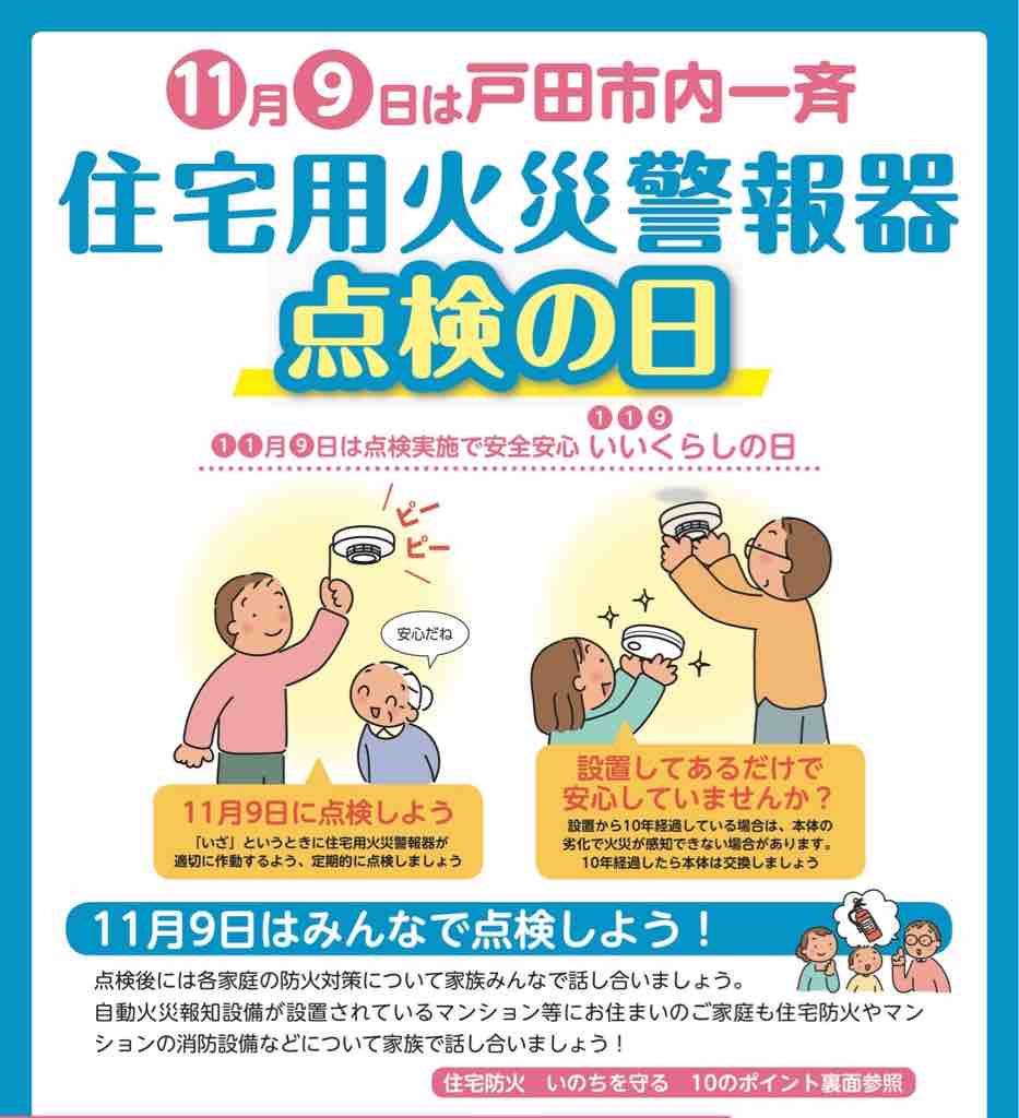 戸田市では毎年11月9日を「戸田市内一斉住宅用火災報知器点検の日」と定め、毎年この日に住宅用火災報知器点検を呼びかけています。また、本日11月9日から15日までは「秋の火災予防運動」期間です。