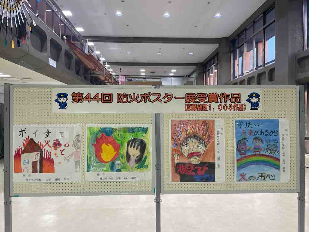 ■「第44回防火ポスター展受賞作品」のうち戸田市立小学生の16作品が戸田市役所2階展示ロビーで紹介されています。応募総数1003点から選ばれた受賞作品を観に来てください。