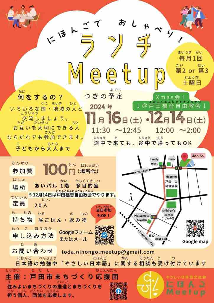 毎月1回、第2もしくは第3土曜日のどちらかで開催される「にほんごでおしゃべり、ランチミートアップ」が、明日11月月16日土曜日に開催されます。