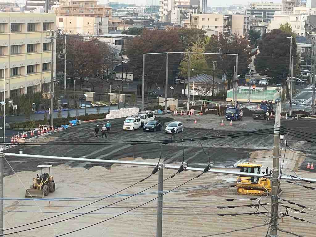 ■戸田市立戸田第一小学校の建て替え最終段階に。運動場を囲むように防球フェンスが張られ、運動場への土入れが進んでいます。11月22日現在の状況をご覧ください。引き渡しは来月です。