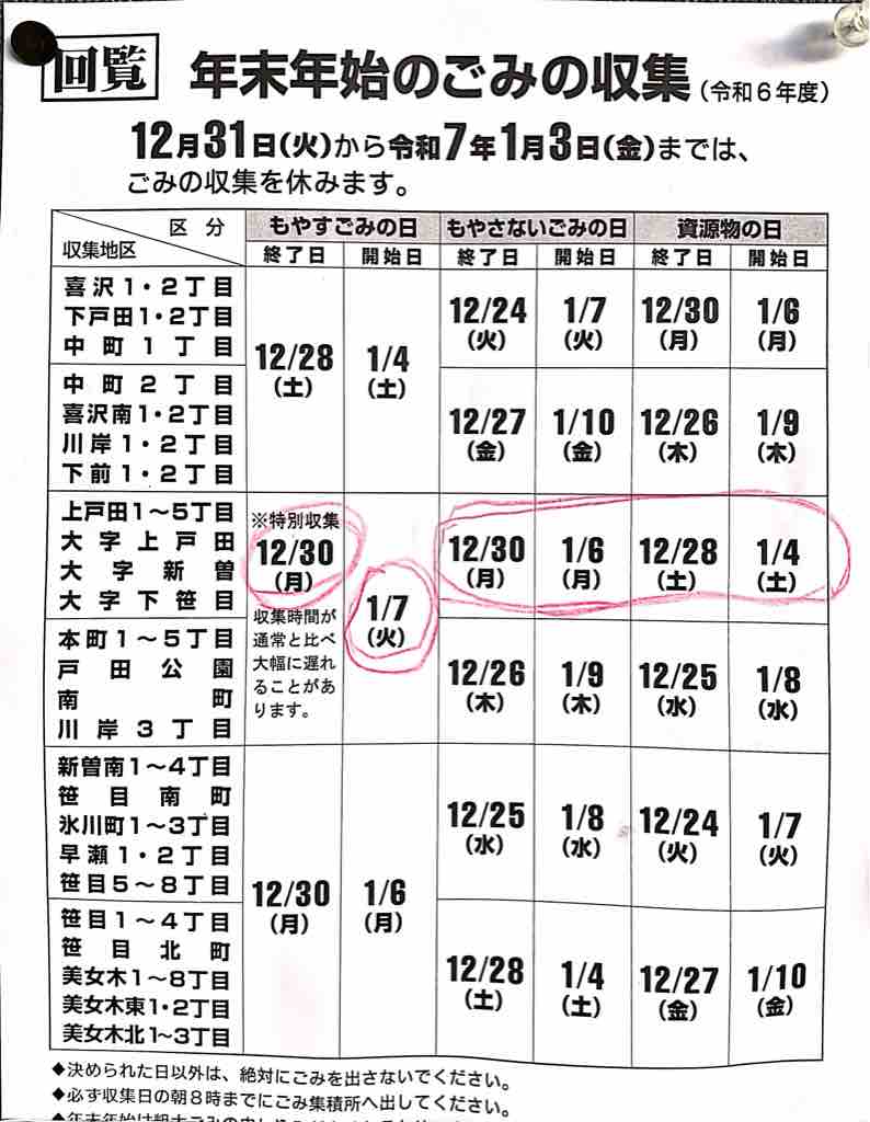 ¢£¸ÍÅĻԡÖǯËöǯ»Ï¤Î¤´¤ß¤Î¼ý½¸Æü¤Î¤ªÃΤ餻¡×¤Ç¤¹¡£¤ª½»¤Þ¤¤¤ÎÃϰè¤Ë¤è¤Ã¤Æ¼ý½¸Æü¤¬°Û¤Ê¤ê¤Þ¤¹¡£Ç¯Ëö¤ÏÁᤤ¤È¤³¤í¤Ç24Æü¤¬Ç³¤ä¤µ¤Ê¤¤¤´¤ß¼ý½¸ºÇ½ªÆü¤Ç¤¹¡£¤ªµ¤¤ò¤Ä¤±¤¯¤À¤µ¤¤¤Í¡£