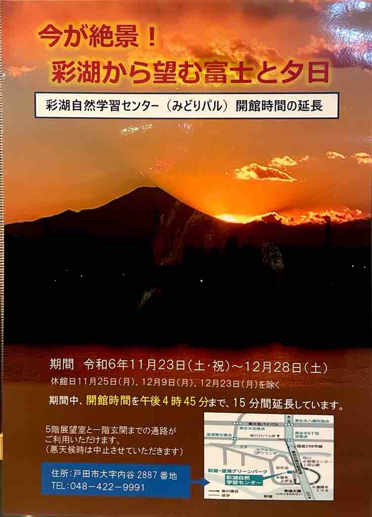 ■彩湖自然学習センター屋上で「彩湖から望む富士と夕日」を見よう!12月28日(土曜日)まで、彩湖自然学習センター(みどりパル)開館時間を16時45分まで延長しています。