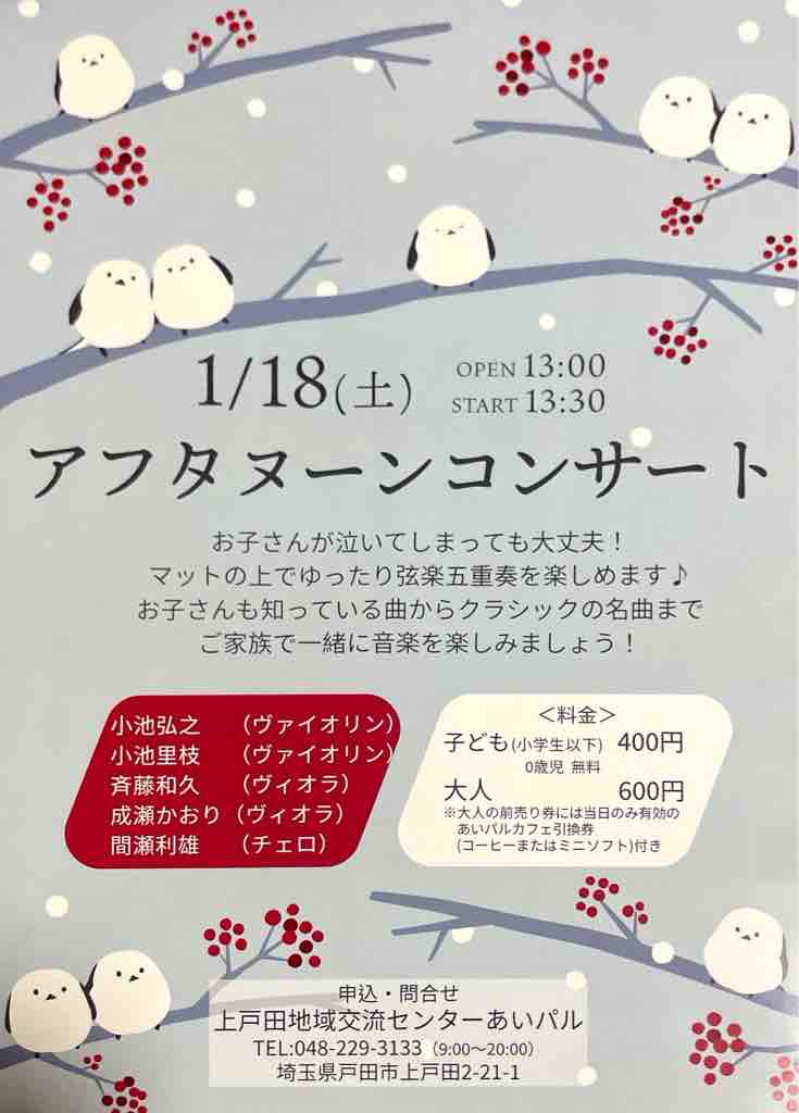 ■上戸田地域交流センターあいパルで1月18日(土)13時半から開催「アフタヌーンコンサート」は泣いてしまうお子様がいても大丈夫な催し。マットの上で弦楽五重奏を楽しめます!