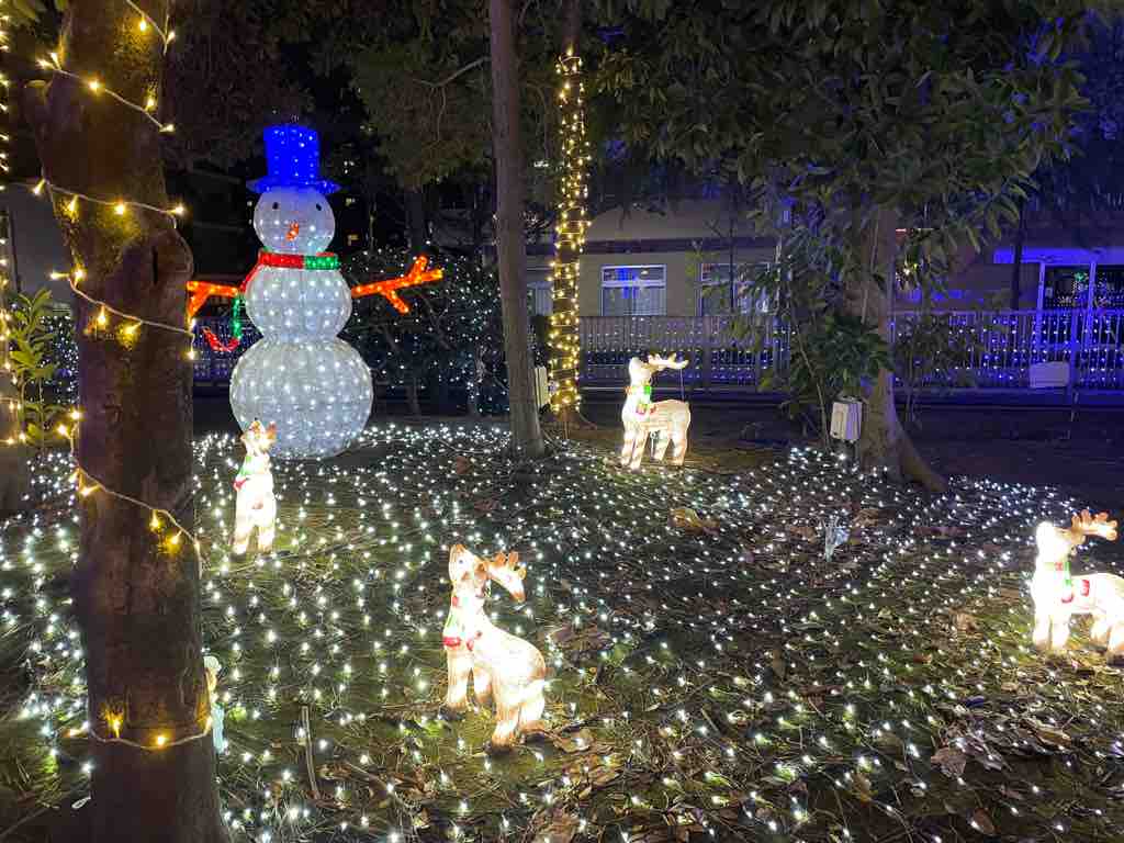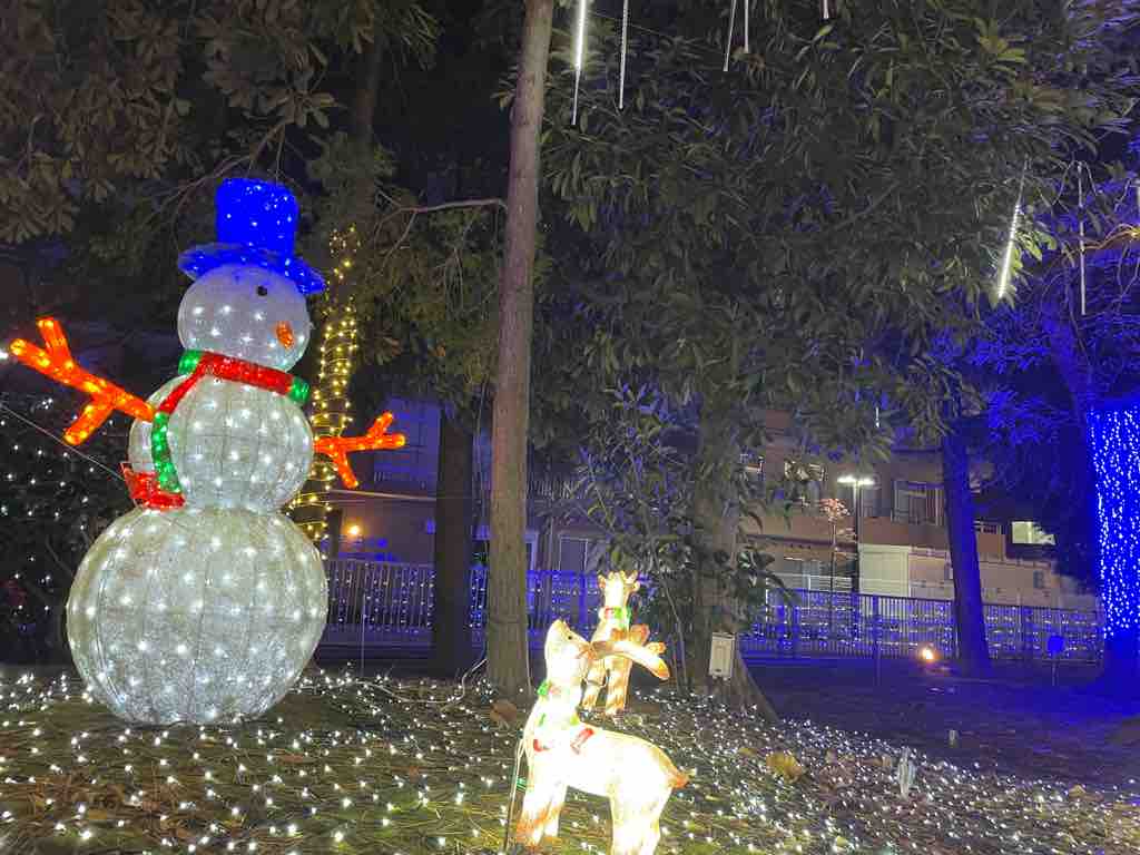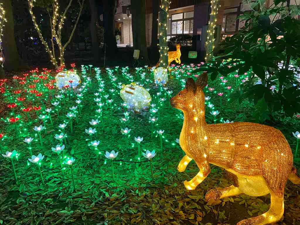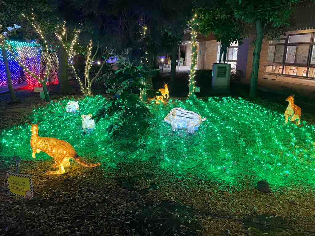 地域イルミ、特にこどもの国の中は、動物たちが今にも動きだしそうな夢の国になっています。地域の方にイルミネーションの光で安心と楽しさを感じてもらいたいと思われた故・中村隆俊氏の遺志が今なお紡がれてれています。
