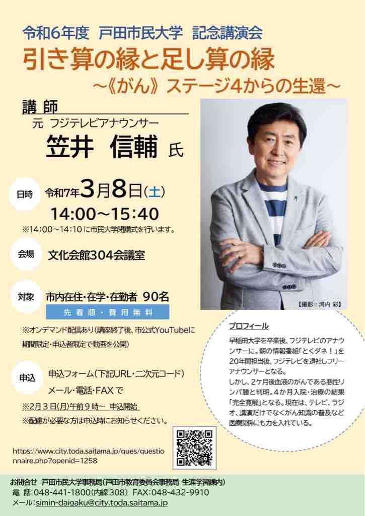 ■戸田市民大学記念講演会「引き算の縁と足し算の縁〜《がん》ステージ4からの生還〜」講師は笠井信輔氏(元フジテレビアナウンサー)。3月8日(土)開催。申込開始は2月3日から。