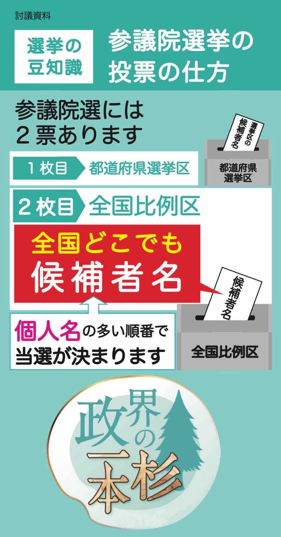 ■本日、参議院議員一般選挙の公示日です。投票用紙は2枚。1枚目は選挙区の候補の名前を書きます。2枚目の白地に赤文字の投票用紙には全国比例区の「候補者名」を書いてください。