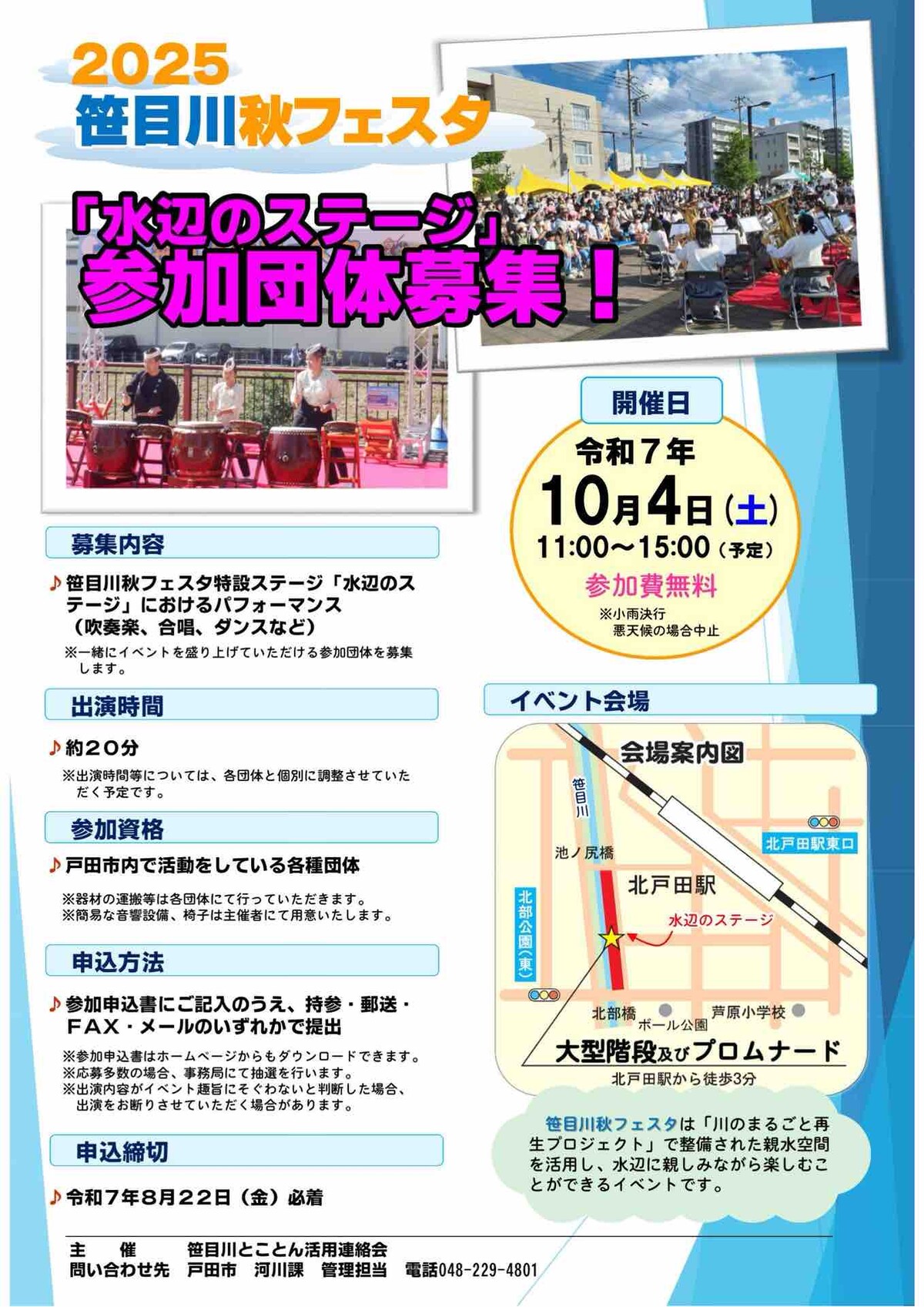 ■2025笹目川秋フェスタでの水辺のステージに出演する参加団体募集中!吹奏楽・合唱・ダンスなど約20分のパフォーマンスが可能です。申込締切は8月22日。ぜひ応募ください。