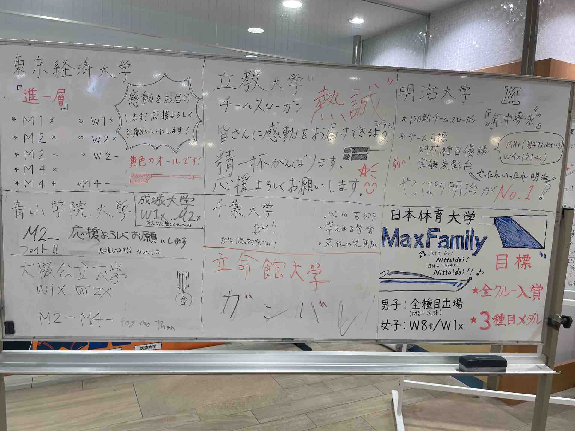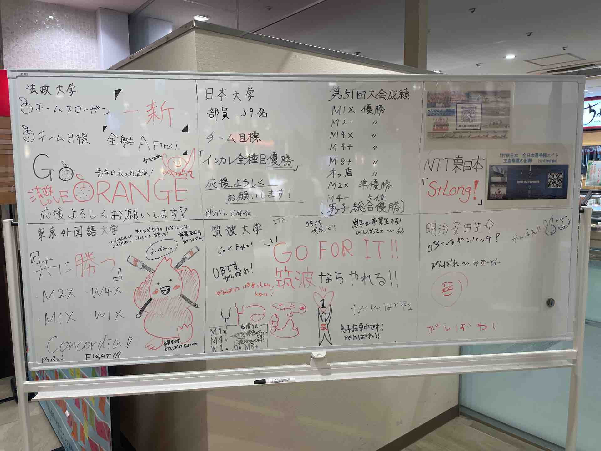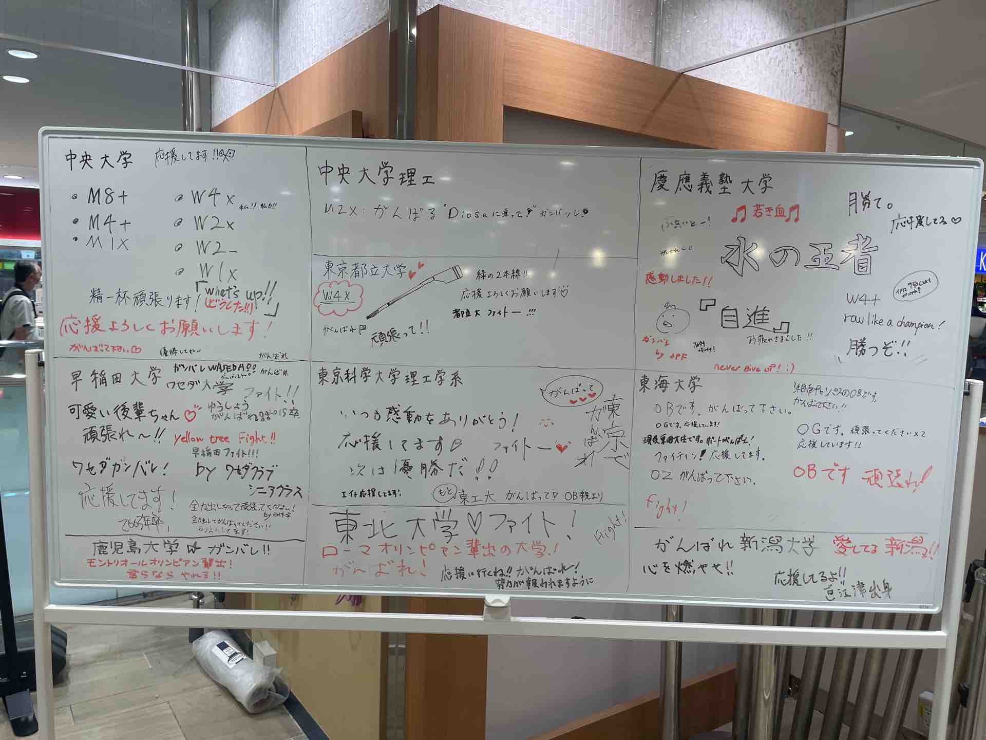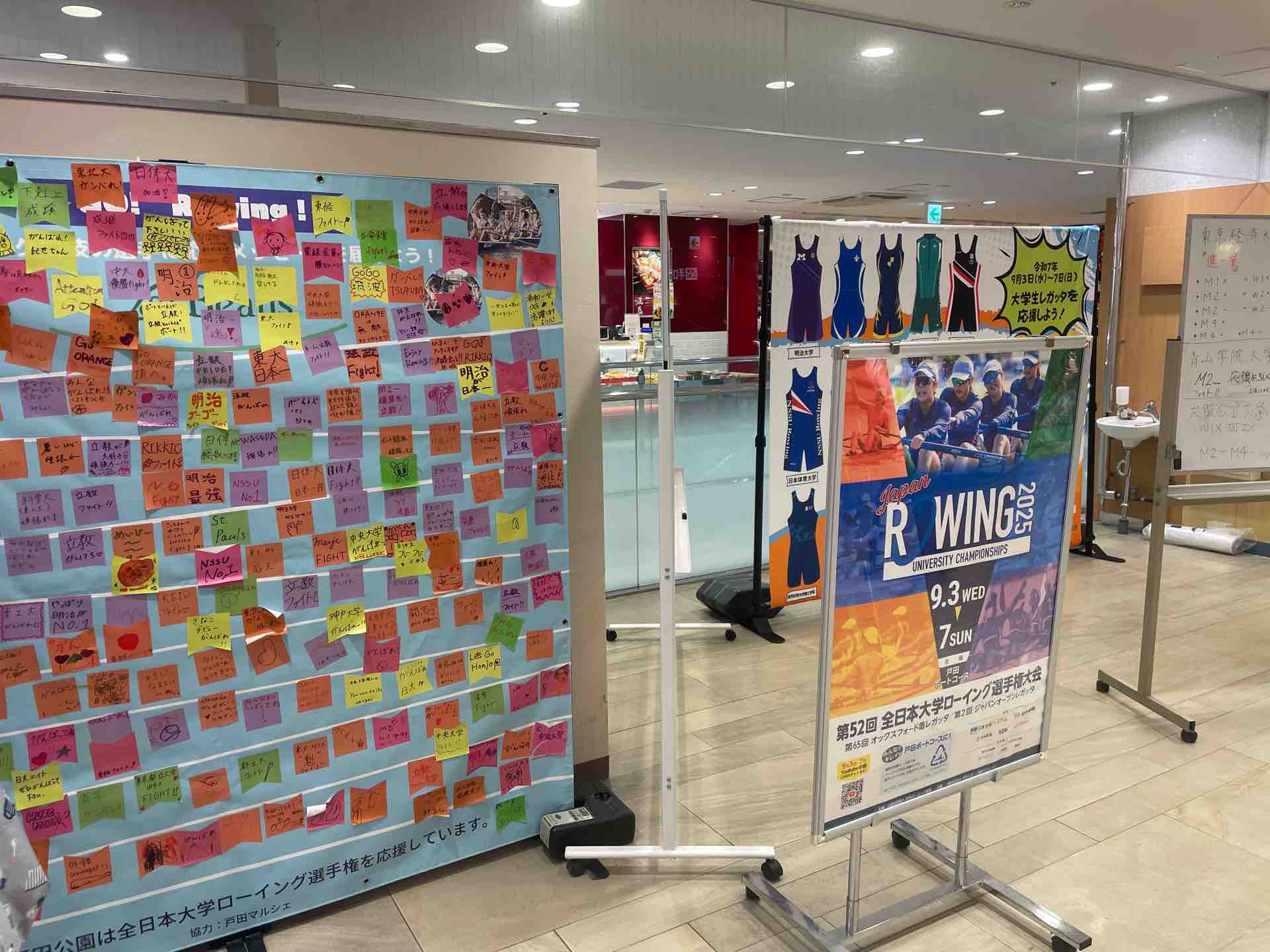 ■全日本大学ローイング選手権大会が戸田ボートコースを会場に9月3日(水)から8日にかけて開催。ビーンズ戸田公園2階の特設コーナーには応援メッセージが続々集まっています!