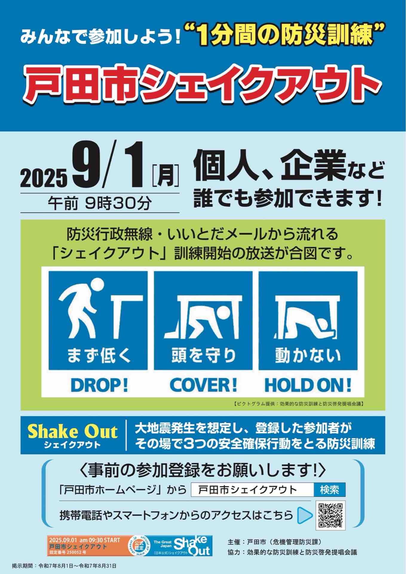 本日2025年9月1日(月)午前9時30分、戸田市で実施されるのは「戸田市シェイクアウト訓練」。市内在住・在勤・在学の皆さん、職場、自宅、学校など、その場にいる誰もが参加可能です。防災行政無線や「いいとだメール」で訓練開始の合図が流れたら、ぜひその場で実施してくださいね。