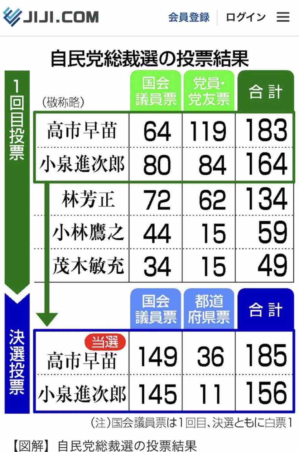 しかし、その直後にあった発表で高市早苗さんの議員票が小泉進次郎の議員票をうわまった瞬間、えっ!・・・あっ!・・・えっ!勝った?・・・勝った!と思いました。地方票は高市候補が上回るとわかっていたので、議員票で上回ったら決定的でした。