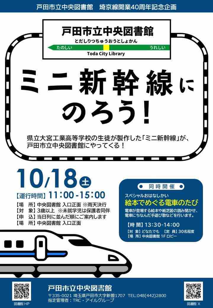 #戸田市立中央図書館 #埼京線開業40周年 #鉄道イベント #ミニ新幹線 #絵本でめぐる電車のたび #鉄道の魅力 #JR東日本 #電車好きと繋がりたい #親子でおでかけ #図書館イベント #戸田市 #鉄道ファン必見