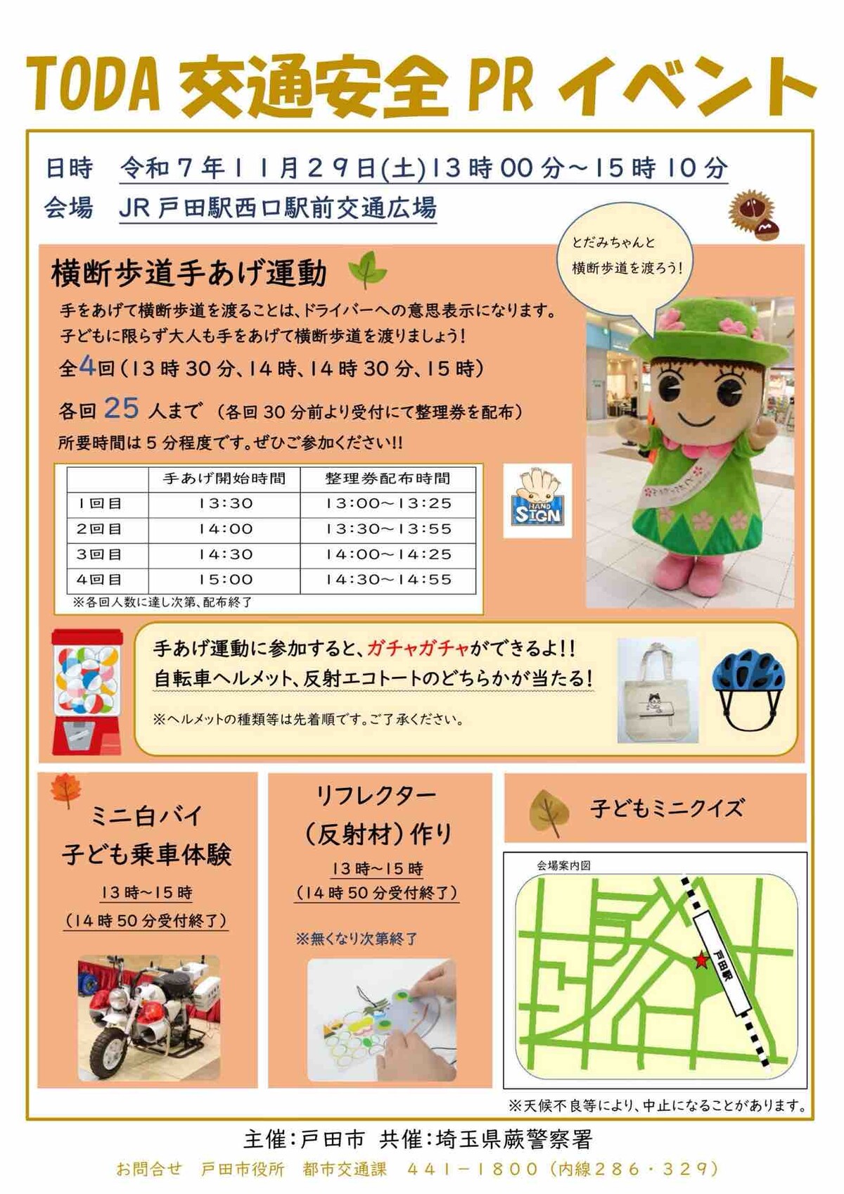 ¢£¼ê¤òµó¤²¤Æ²£ÃÇÊâÆ»¤òÅϤê¤Þ¤·¤ç¤¦¡ª¡ÖTODA¸òÄ̰ÂÁ´PR¥¤¥Ù¥ó¥È¡×¤¬¼¡¤ÎÅÚÍËÆü¡¦11·î29Æü13»þ¤«¤é¸ÍÅıØÀ¾¸ý±ØÁ°¸òÄ̹¾ì¤Ç³«ºÅ¤µ¤ì¤Þ¤¹¡£