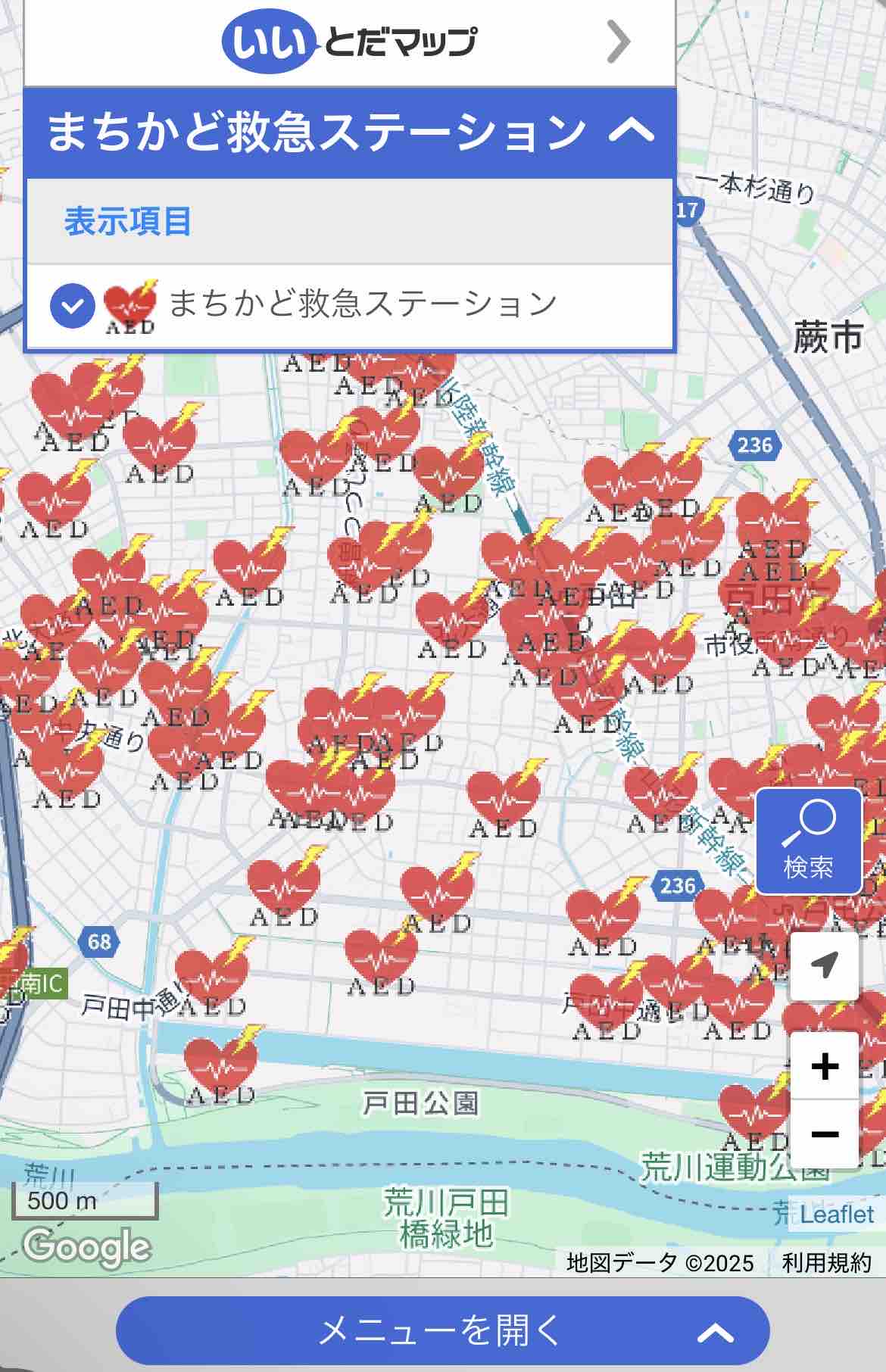 戸田市ではまず全てのコンビニにAEDが設置されています。そのほかにも置いている場所があります。それを含めて「まちかど救急ステーションマップ」にはAEDがある場所が掲載されています。