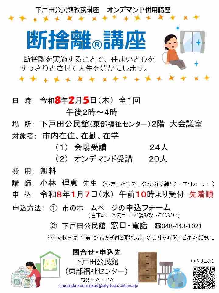 そんな方におすすめの講座が、戸田市立下戸田公民館で開催されます。「暮らしと心を整える断捨離講座」です。
