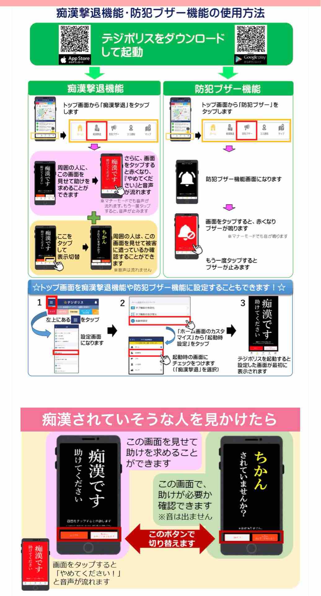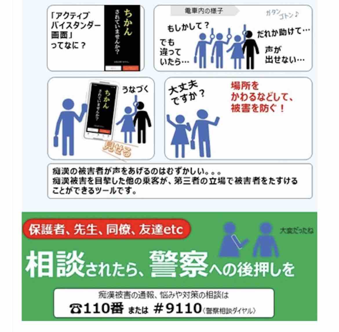 なお、添付画像2枚目以降は、デジポリスにある「電車内の痴漢防止対策」の一部です。スマホで「デジポリス」アプリをダウンロードください。デジポリスは警視庁アプリで東京都が主ですがその内容は役に立ちます。
