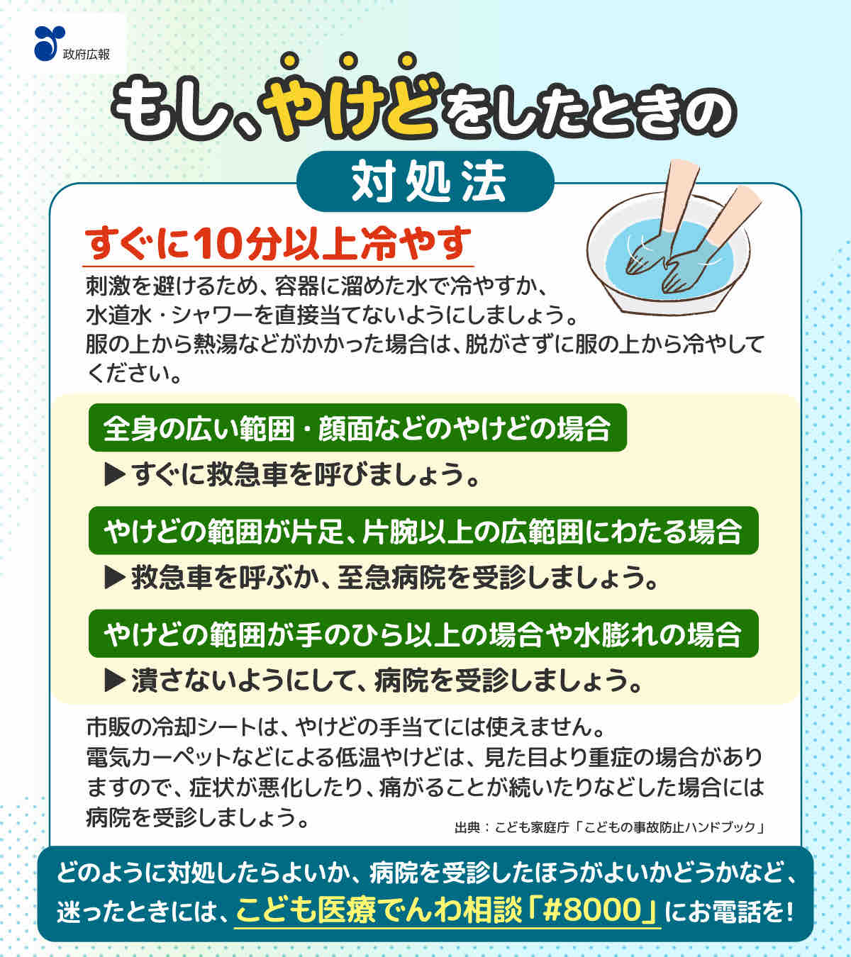 また、やけどの広がりや部位によっては、すぐに救急車を呼ぶ判断が必要です。
