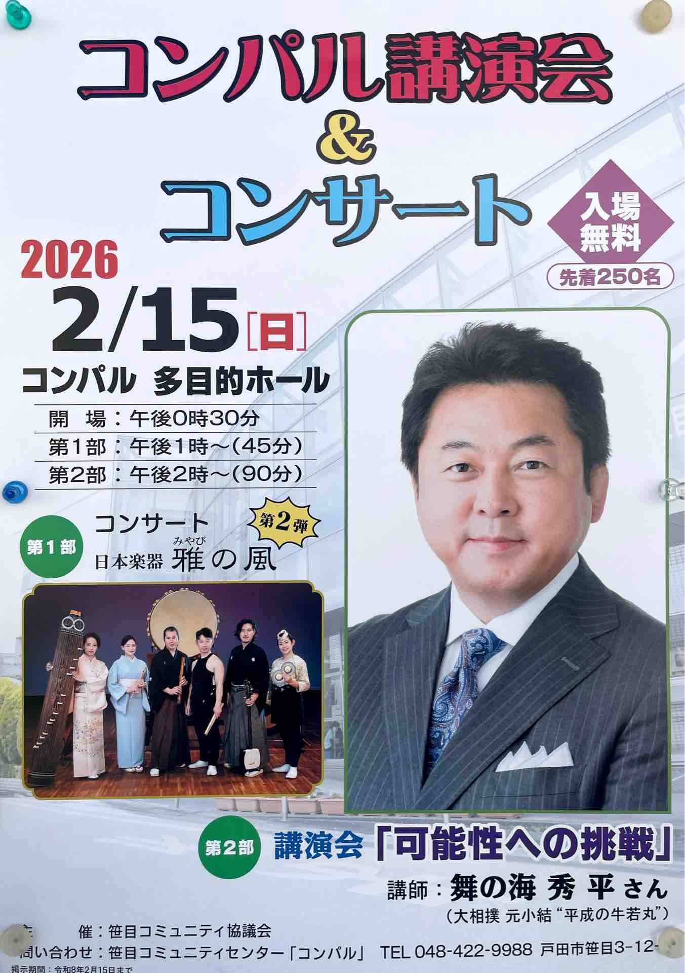 #戸田市イベント #コンパル講演会 #雅の風 #舞の海秀平 #可能性への挑戦 #和楽器コンサート #相撲解説 #地域イベント #無料イベント #2月15日 #林冬彦 #戸田市 #戸田市議会
