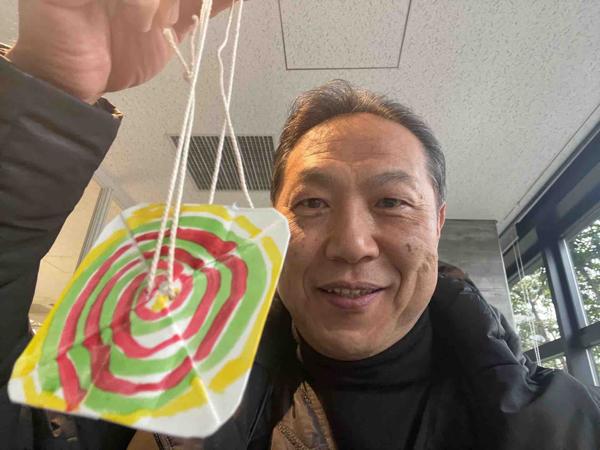 牛乳パックの底部の四角の紙を切り取ったものに、マジックペンで裏表に模様を描き、中心にある二つの穴に凧糸を通してできあがり。描いた紙を中心におきながら、凧糸の両端を左右の手で握って中心から両端に向かってねじれが起こるようにクルクル回した後に凧糸を引っ張ったり緩めたりすることで中心の髪がぐるぐる🌀まわる仕組みです。これ面白い!そんな体験でした。