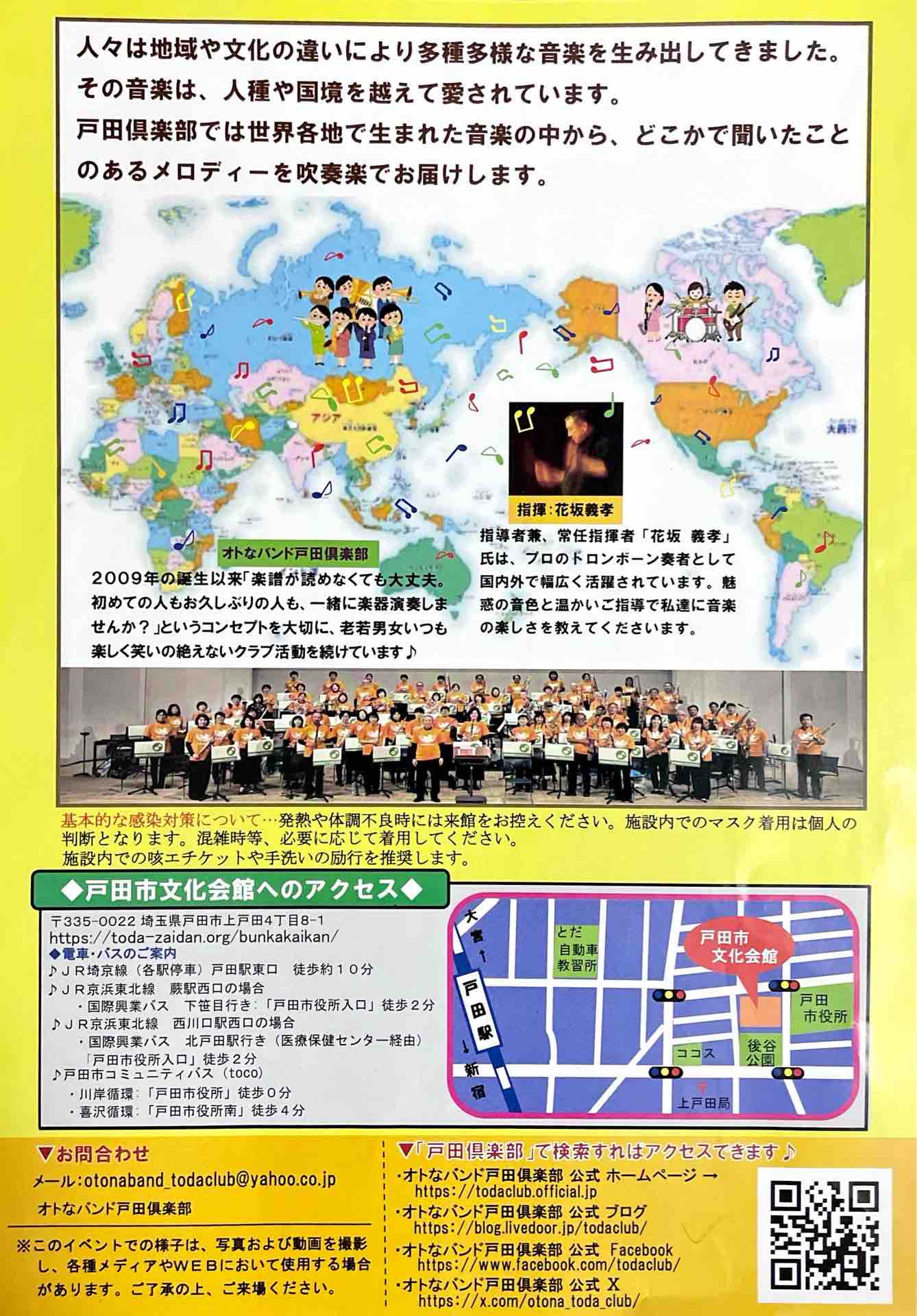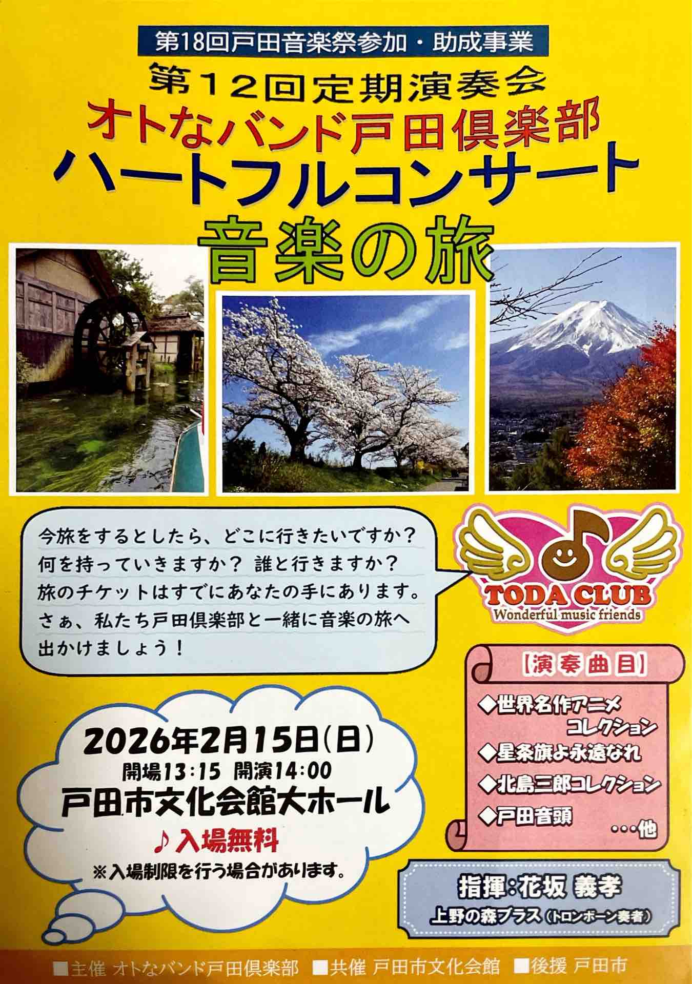 ■明後日の日曜日(2月15日)オトなバンド戸田倶楽部「ハートフルコンサート音楽の旅」が戸田市文化会館大ホールで開催されます。音楽で巡る世界の旅!入場無料です。