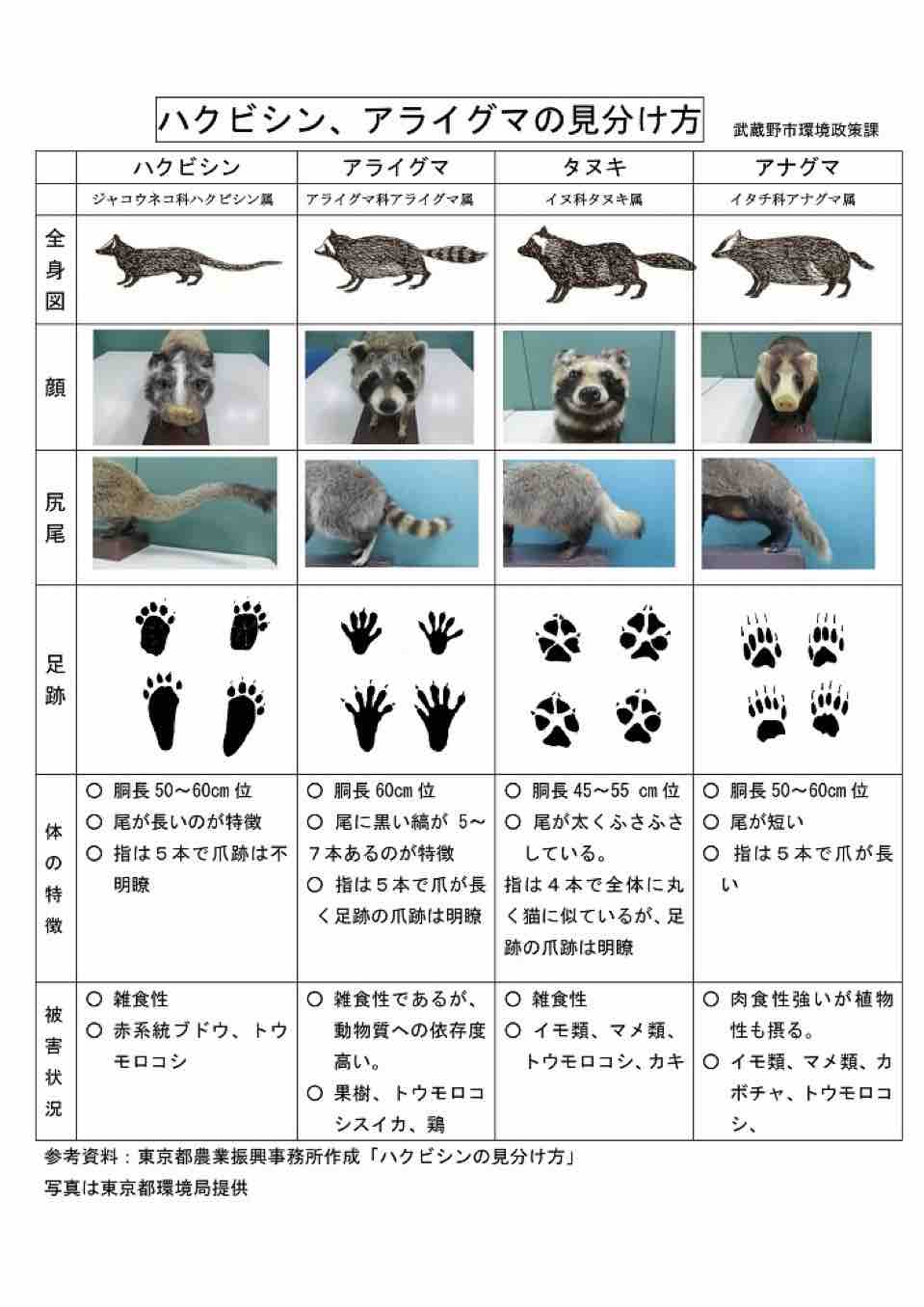 戸田市の捕獲・駆除の対象はアライグマとハクビシンのみです。ハクビシン、アライグマ、タヌキの見分け方については、武蔵野市環境課作成の添付画像を参照してください。