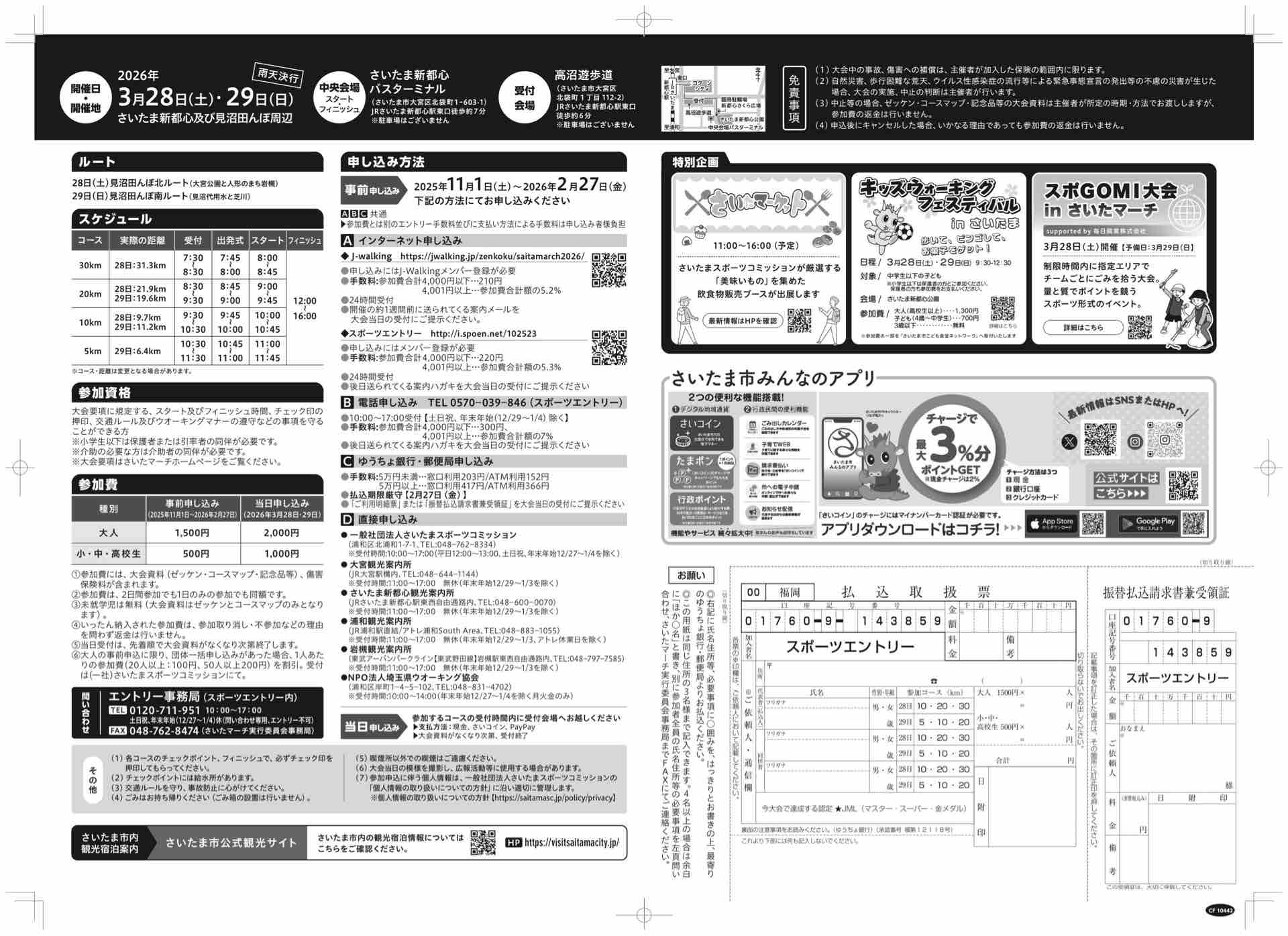 事前申し込みの参加費は大人1500円(当日は2000円)、小・中・高校生は500円(当日は1000円)です。この金額には、当日資料(ゼッケン、コースマップ、景品)と傷害保険料が含まれています。