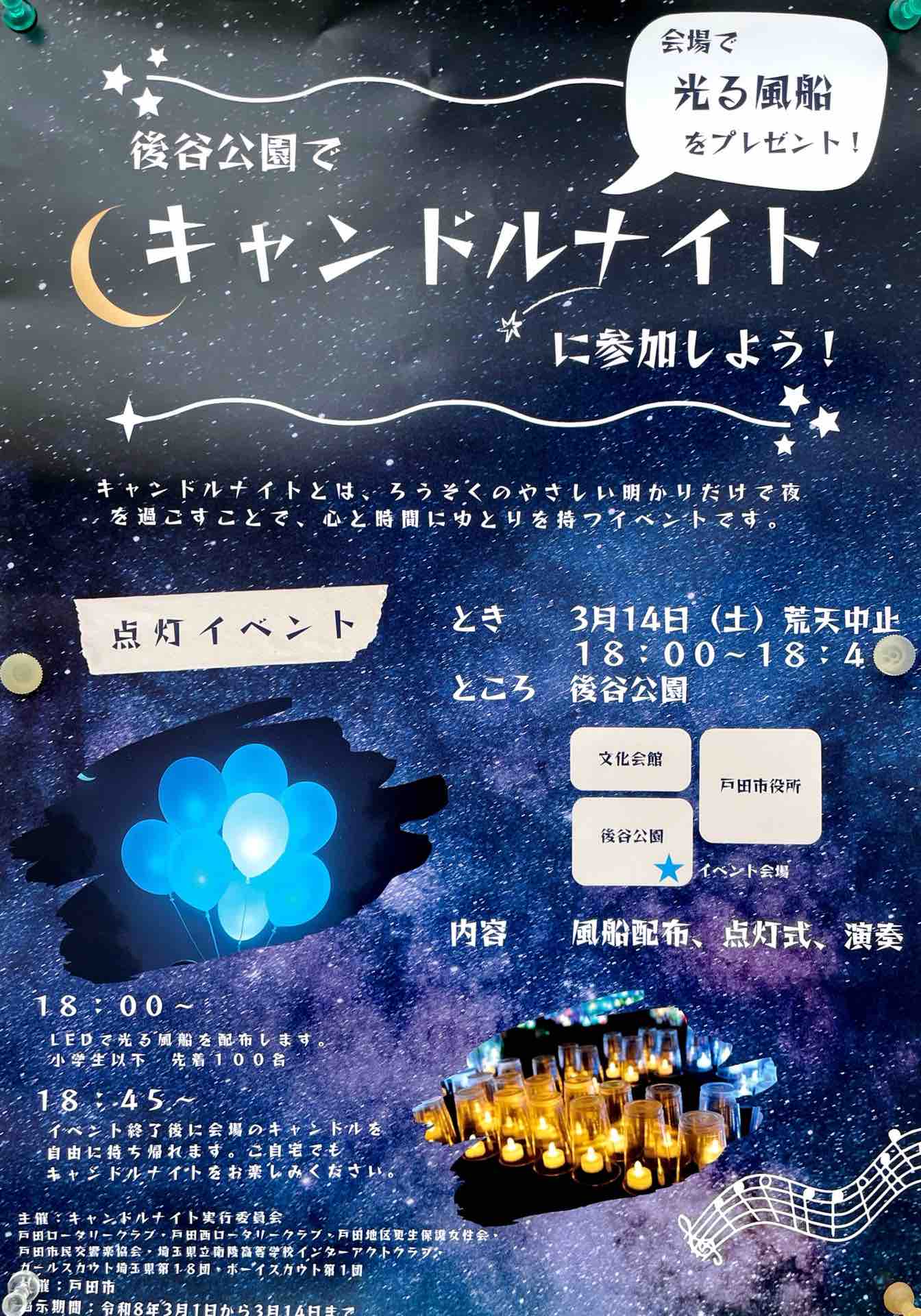 3月14日(土)、戸田市役所西側・戸田市文化会館南側の後谷公園を会場に「キャンドルナイト」が開催されます。